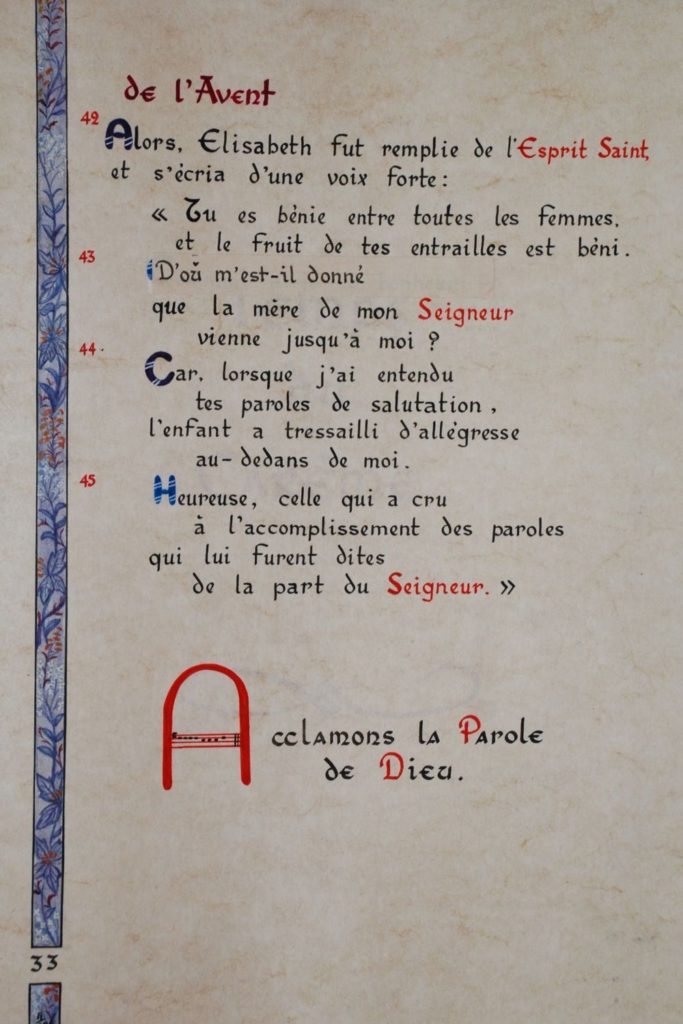 Or, quand Élisabeth entendit la salutation de Marie, l’enfant tressaillit en elle. Alors, Élisabeth fut remplie d’Esprit Saint, et s’écria d’une voix forte :